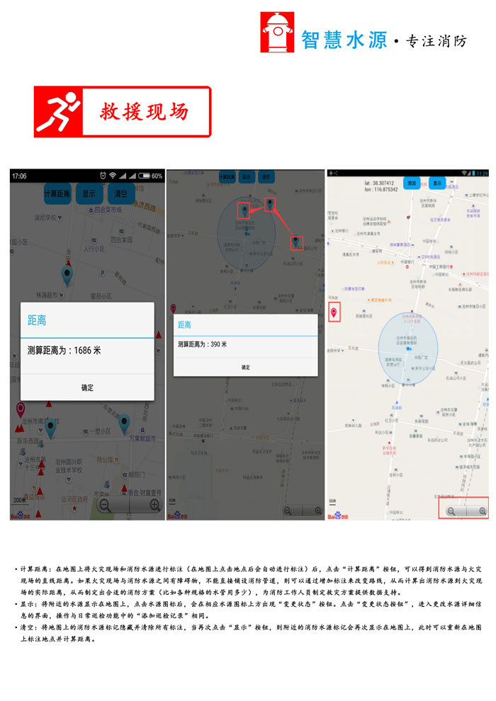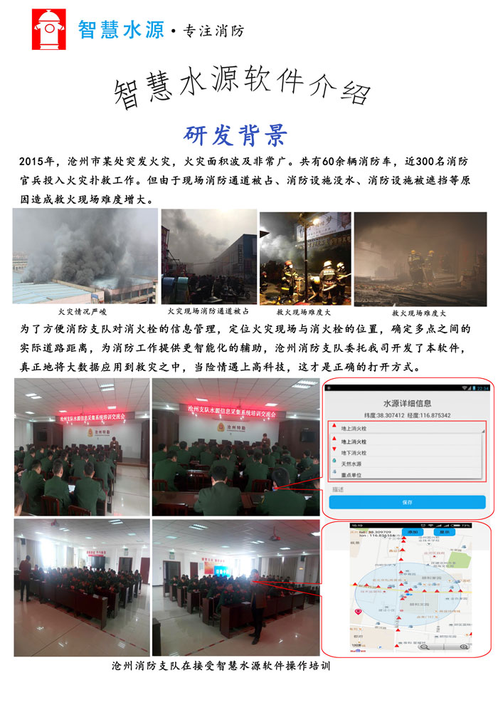 为了方便消防支队对消火栓的信息管理,定位火灾现场与消火栓的位置,确定多点之间的实际道路距离,为消防工作提供更智能化的辅助,沧州消防支队委托我司开发了本软件,